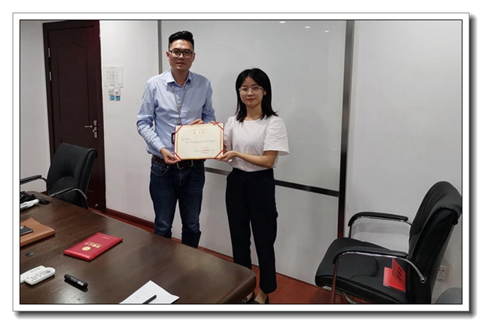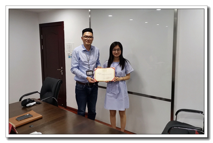 人力資源部孫陽瑯向鄭夢(mèng)莎頒發(fā)優(yōu)秀學(xué)員證書